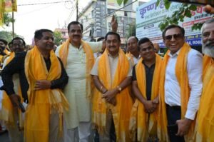 भोंपूराम खबरी,रूद्रपुर। मंदिर मनकामेश्वर कल्याण आश्रम, कल्याणी व्यू जी में महंत स्वामी श्रीनारायण चैतन्य ब्रहम्चारी महाराज जी के मुखारबिन्द से आयोजित होनें वाली श्रीमद् भागवत कथा के निमित आज मंदिर मनकामेश्वर कल्याण आश्रम से भव्य कलश यात्रा का आयोजन हुआ। इस श्रीमद् भागवत कथा के आयोजक गंभीर परिवार के सदस्य व श्री रामलीला कमेटी के कोषाध्यक्ष सीए अमित गंभीर व उनकी धर्मपत्नी सीए सानिया गंभीर मंदिर के महंत स्वामी श्रीनारायण चैतन्य ब्रहम्चारी महाराज जी साथ सबसे आगे श्रीमद्भागवत जी एवं कलश उठाकर चल रहे थे, साथ ही सैंकड़ों की संख्या में मातृशक्ति भी सर पर कलश उठाये भव्य कलश यात्रा में सहभागिता कर रहे थे।