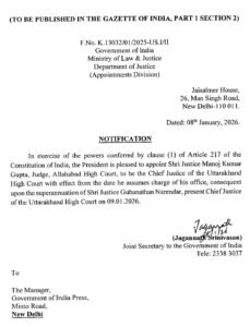 पत्र में कहा गया है कि न्यायाधीश मंनोज कुमार गुप्ता को ऊत्तराखण्ड उच्च न्यायालय के वर्तमान मुख्य न्यायाधीश गुहानाथन नरेंद्र के 9 जनवरी 2026 को सेवानिवृत्त होने के बाद इस पद पर नियुक्त किया जा रहा है। वह इस पद और गोपनीयता की शपथ लेने के बाद जिम्मेदारी को संभाल लें।