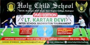 भोंपूराम खबरी। होली चाइल्ड स्कूल में स्वर्गीय करतार देवी अंतर-विद्यालयी बैडमिंटन चैंपियनशिप का आयोजन किया गया। इस चैंपियनशिप में रुद्रपुर, हल्द्वानी, भीमताल, सितारगंज और आसपास के क्षेत्रों के 11 साल से कम आयु वर्ग एकल एवं युगल कुल 22 स्कूलों के खिलाड़ी प्रतिभाग कर रहे हैं। यह प्रतियोगिता दिनाँक 04 दिसम्बर 2025 से 06 दिसम्बर 2025 तक चलेगी। इस प्रतियोगिता ने छात्रों में खेल भावना और स्वस्थ प्रतिस्पर्धा को बढ़ावा देने के लिए स्कूल की प्रतिबद्धता को दर्शाया। अंडर-11 वर्ग में आयोजित इस चैंपियनशिप में 150 से अधिक प्रतिभाशाली छात्र बैडमिंटन के एकल और युगल दोनों मुकाबलों में उत्साहपूर्वक भाग ले रहे हैं।