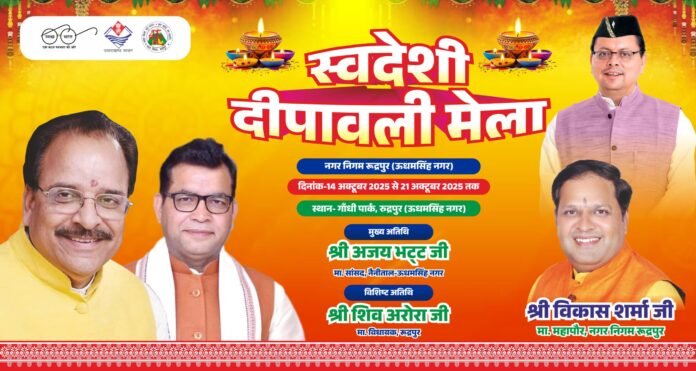 भोंपूराम खबरी,रूद्रपुर। नगर निगम द्वारा पहली बार गांधी पार्क में आयोजित स्वदेशी दीपावली मेला अब पूरे यौवन पर है। 14 अक्टूबर से शुरू हुआ यह मेला 21 अक्टूबर तक चलेगा, जिसमें हर दिन सांस्कृतिक प्रस्तुतियों और स्वदेशी उत्पादों की रौनक देखने को मिल रही है।