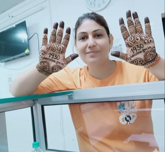 भोंपूराम खबरी। कुमाऊँ क्षेत्र में साइबर क्राइम पुलिस स्टेशन की उप निरीक्षक वंदना चौधरी ने अपनी मेहंदी में साइबर जागरूकता का संदेश देकर एक अनोखी पहल की है। उन्होंने अपनी मेहंदी में *1930* और cybercrime.gov.in का उल्लेख करके लोगों को साइबर सुरक्षा के प्रति जागरूक किया।