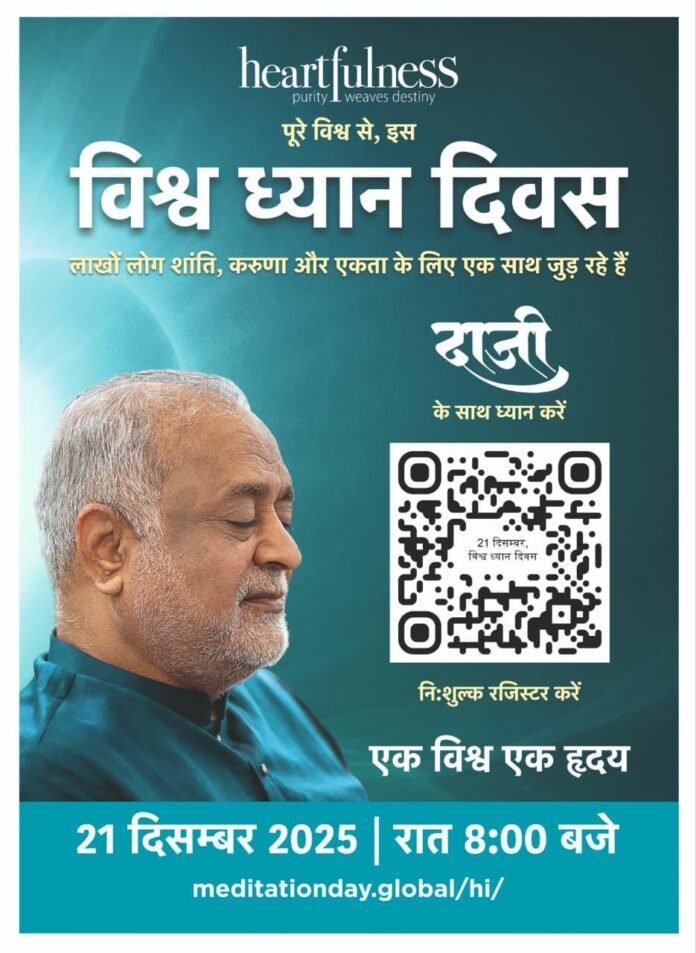 भोंपूराम खबरी। संयुक्त राष्ट्र द्वारा ध्यान और इससे होने वाले लाभों के विषय में जागरूकता बढ़ाने के लिए 21 दिसंबर 2024 को ‘विश्व ध्यान दिवस’ के रूप में घोषित किया गया । इसी श्रृंखला में इस वर्ष भी इस अवसर पर ‘एक विश्व, एक हृदय’ थीम पर आधारित 21 दिसंबर को रात्रि 8 बजे ऑनलाइन माध्यम से हार्टफुलनेस संस्था के वैश्विक मार्गदर्शक दाजी के द्वारा निर्देशित सामूहिक ध्यान कराया जाएगा।
